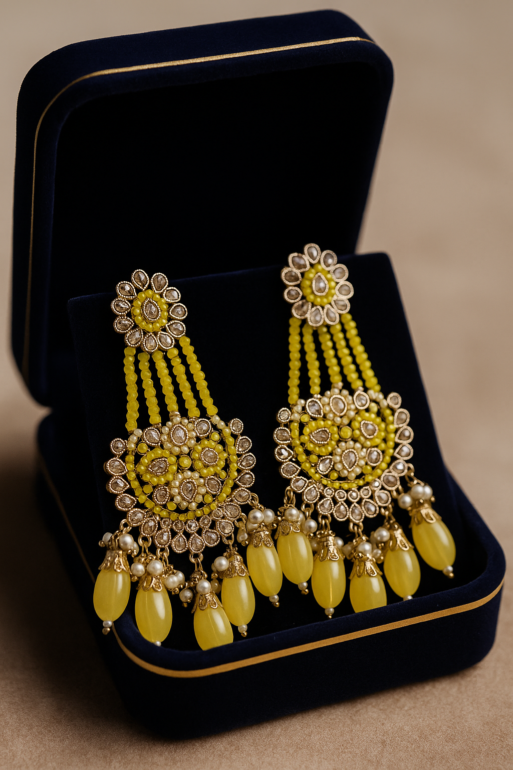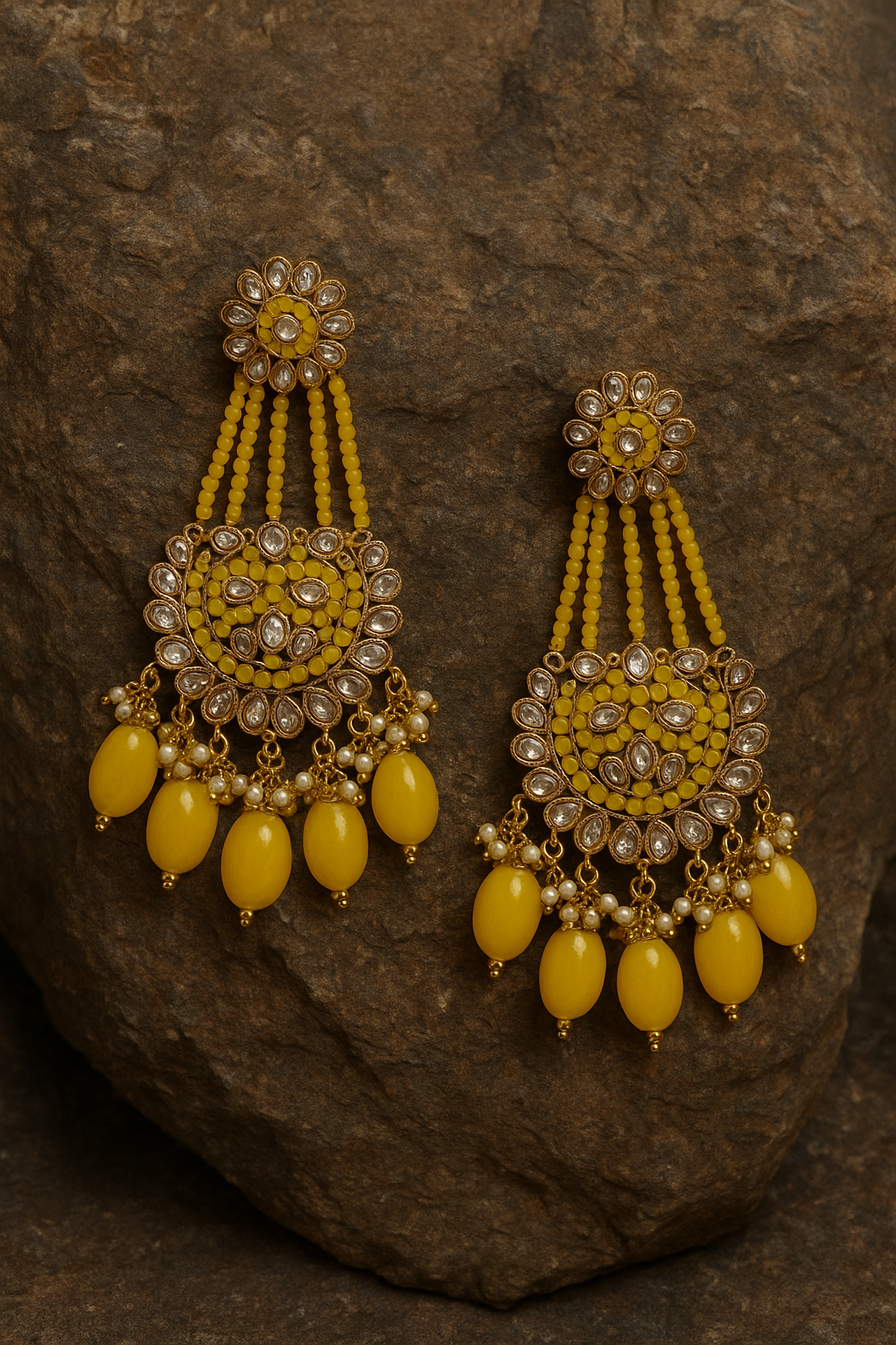 Festive Color Palette: Deep mustard yellow beads perfect for Haldi, Sangeet, or summer celebrations.