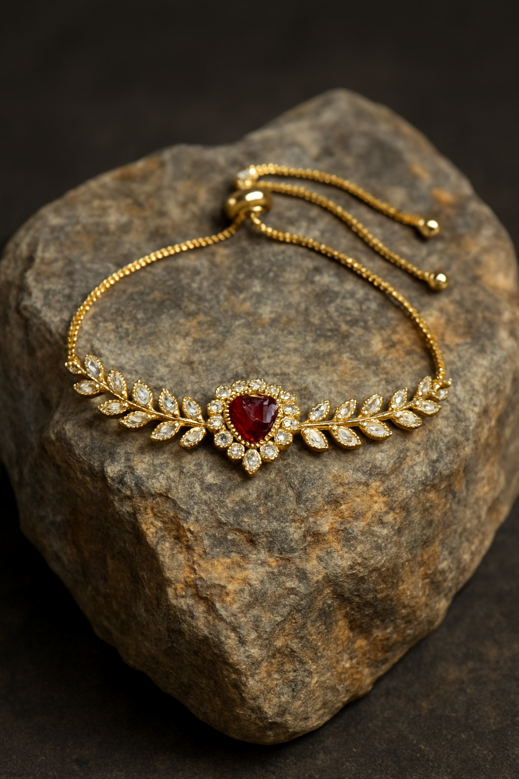 Romantic Centerpiece: Deep crimson heart-shaped faux ruby with brilliant micro-stone halo.