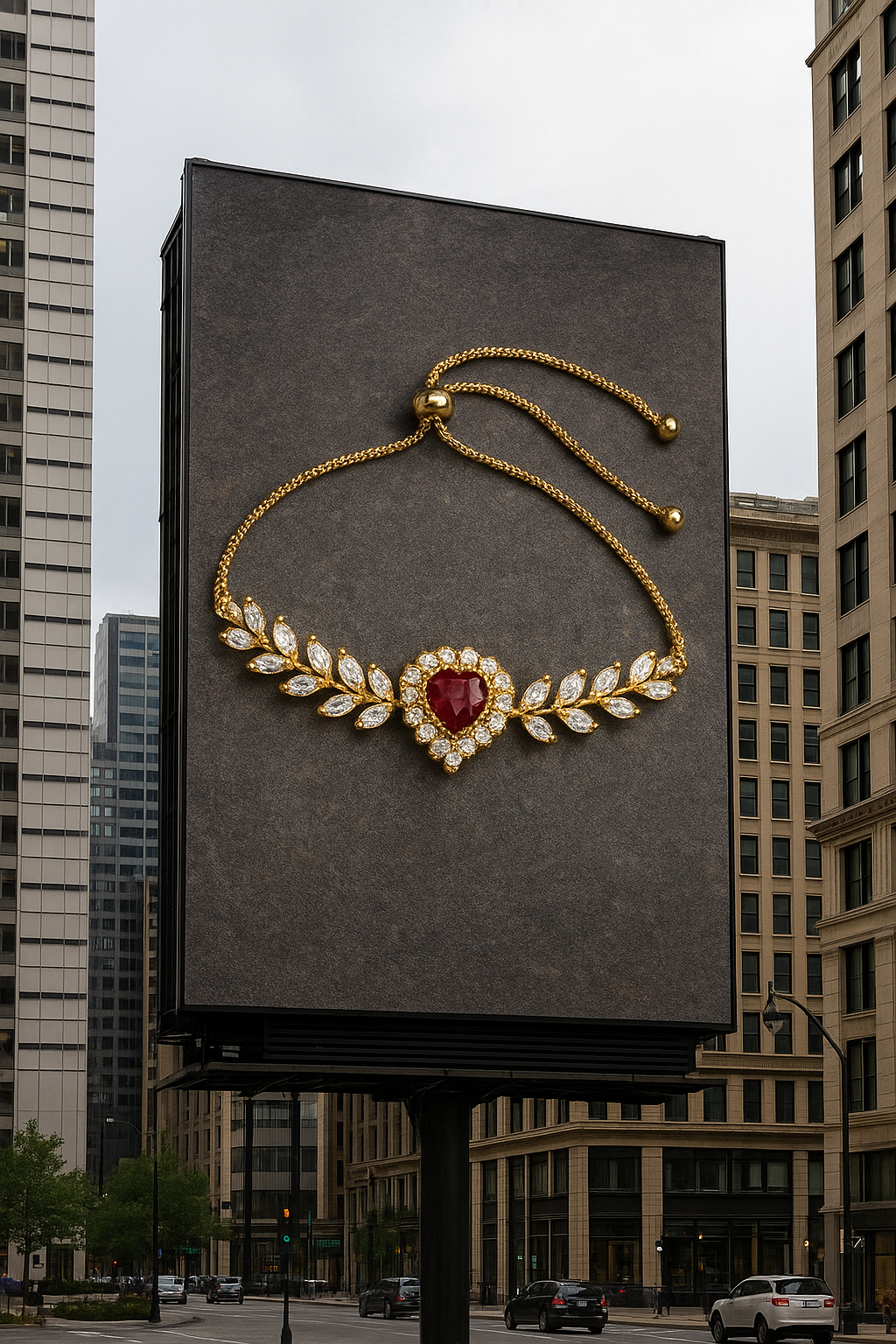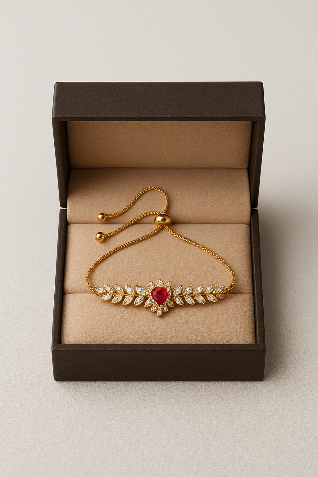 The RoseLune features a slender, adjustable chain that shimmers softly against the skin. At its heart lies a radiant deep crimson faux ruby, prong-set and framed by a halo of micro-pave stones — creating a stunning play of light and color.