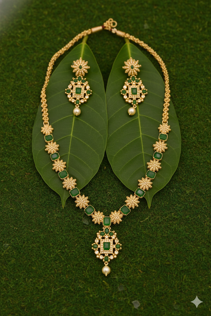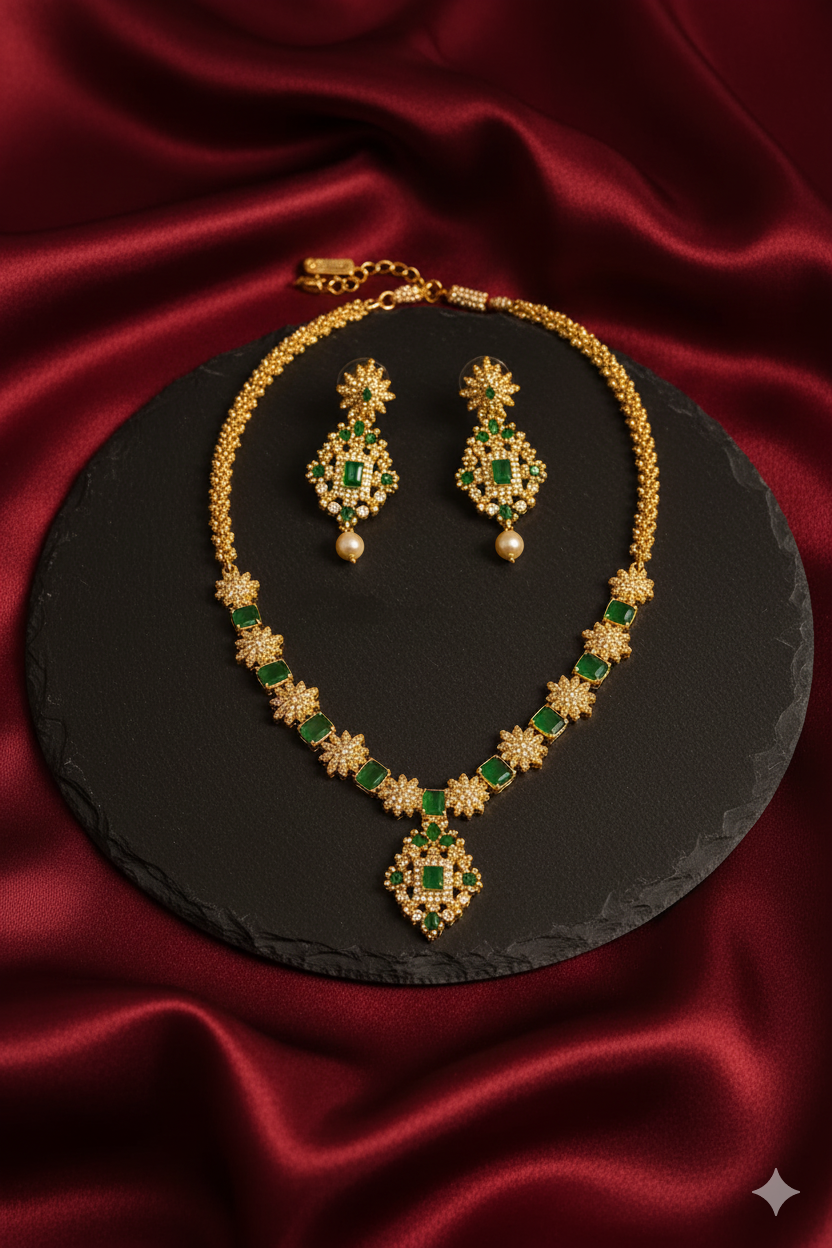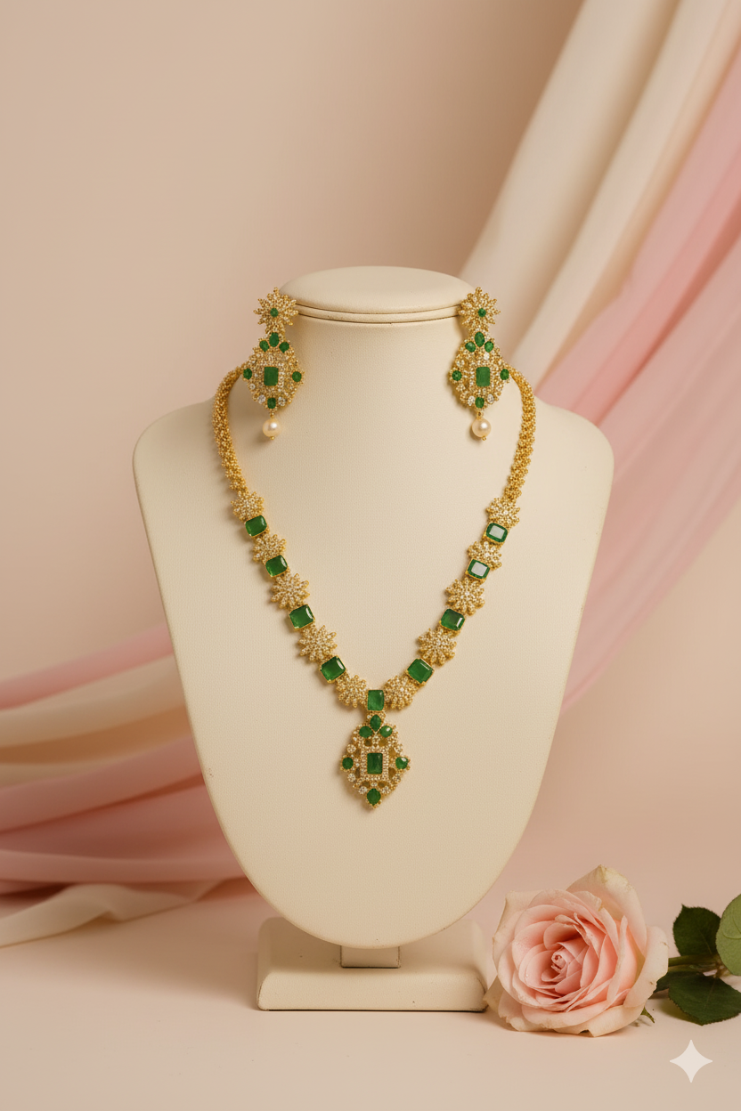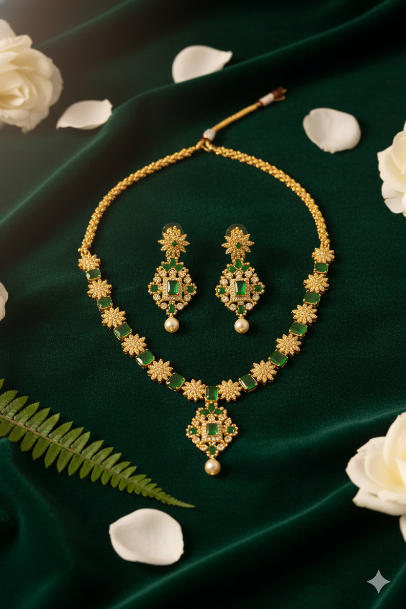 Vibrant Gemstones: Emerald green stones that radiate classic elegance.